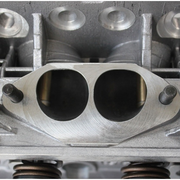 The 40mm intake port has an extremely small port volume of 62cc and flows an incredible 162 CFM and over 300 ft. per second port velocity, right off the shelf! The 35.5mm exhaust port has a reduced bowl size and increased short turn radius creating phenomenal port velocity. This higher port velocity allows for improved low end and mid-range performance without sacrificing top end power.