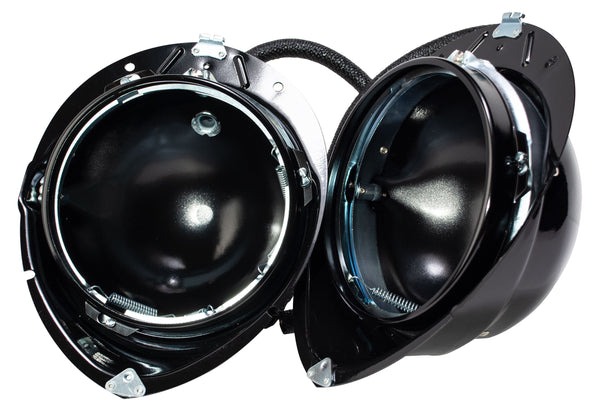 Includes – Bucket housing: Stamped steel painted black; Sealed beam holders to hold sealed beam; Retainers; Adjusting spring; All mounting hardware; Fender gaskets; Wire conduit. Sold in set of 2.