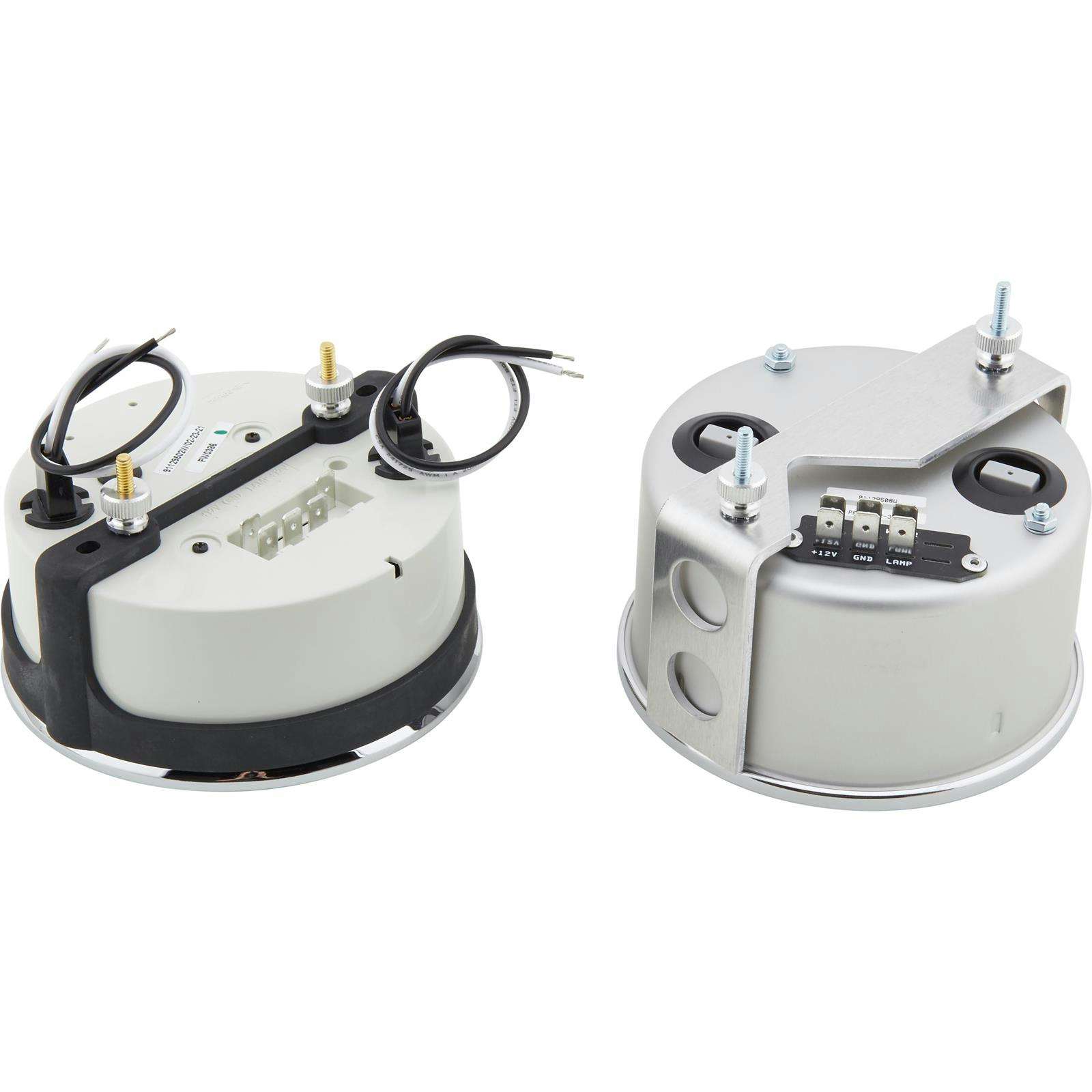 These universal fit 2-gauge sets include an electric 4-5/8″ speedometer and a 4-5/8″ quad gauge that includes: oil pressure, water temperature, fuel level, and voltmeter. The electric programmable speedometer has many functions including trip odometer, hour meter, and over speed indicator. They are compatible with most OEM computers/signal generators, including those found on GM LT1, LS1, and most Fords.