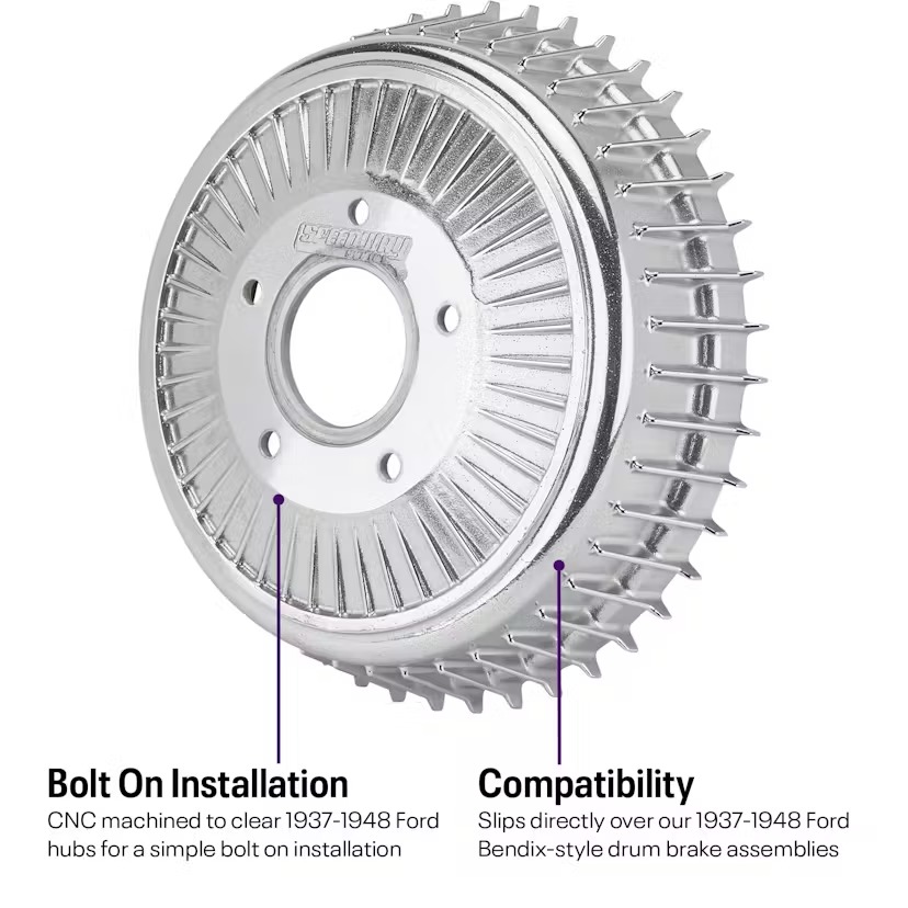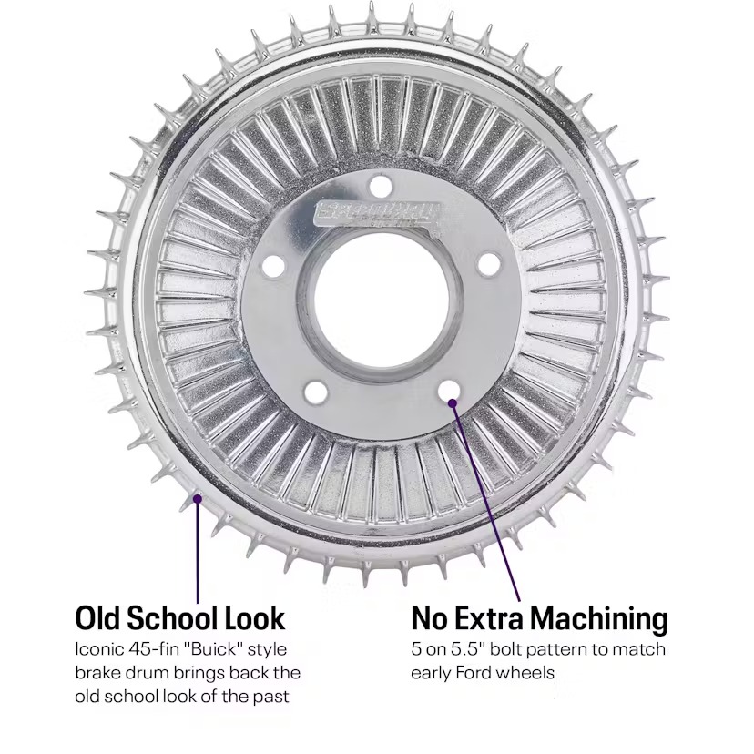 - Iconic 45-fin “Buick” style brake drum brings back the old school look of the past
