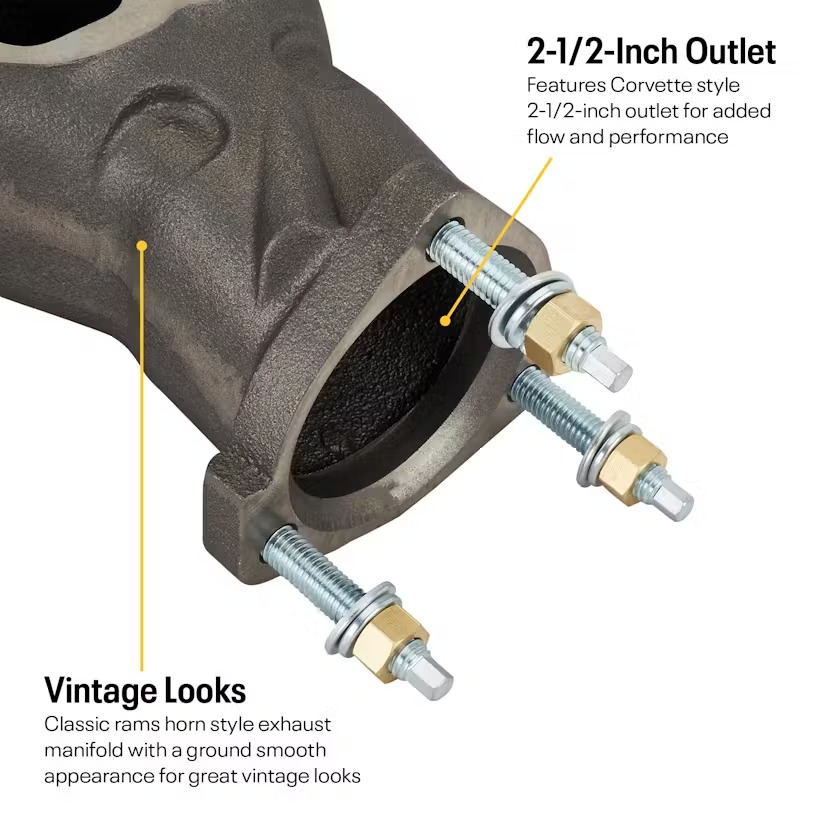 - Increased flow over stock manifolds and utilizes Corvette-style 2-1/2-inch 3-bolt collector