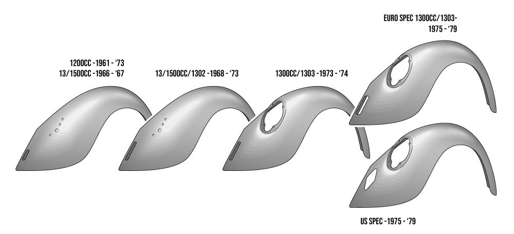 Rear right wing. This wing will fit all pre 1967 Beetles and 1200 models from 61-73. This wing features a short bumper slot holes.
